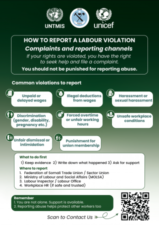 These messages are designed to help workers understand how to report labour rights violations, including available complaint mechanisms and reporting channels, enabling workers to claim their key rights under the newly amended Labour Code. They are available in Somali language as well as in English, ensuring broad accessibility for workers across different communities.