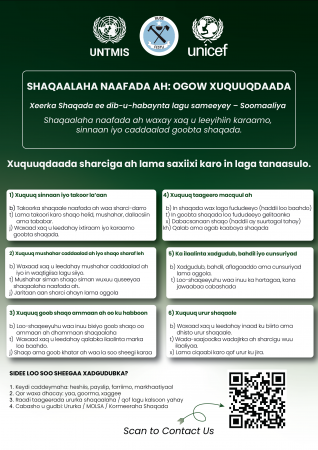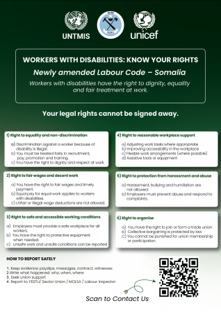 These messages are designed to help workers with disabilities easily understand and claim their key rights under Somalia’s newly amended Labour Code. They are available in Somali (Maxaa Tiri and Maay) as well as in English, ensuring broad accessibility for workers with disabilities across the country, under the theme “Your legal rights cannot be signed away.”